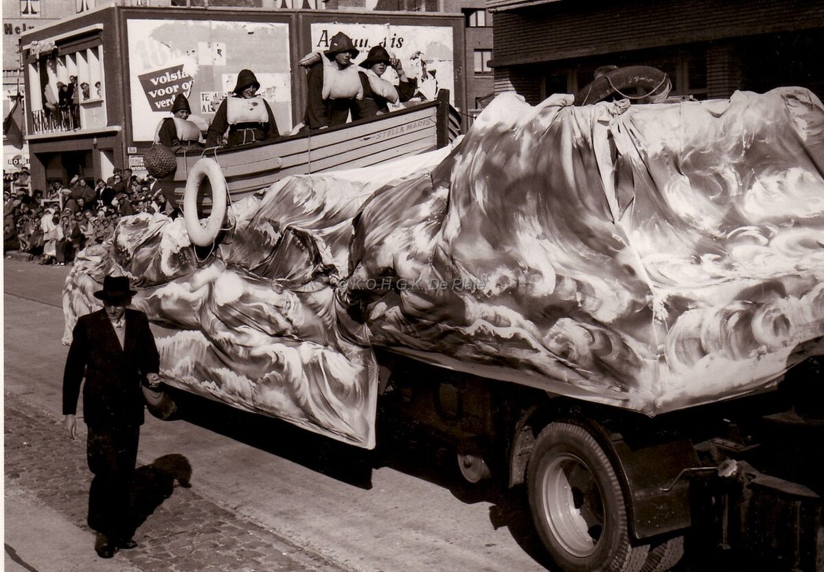 Praalwagen (met redders) uit de stoet der Zeewijding komt voorbij op de Visserskaai.
