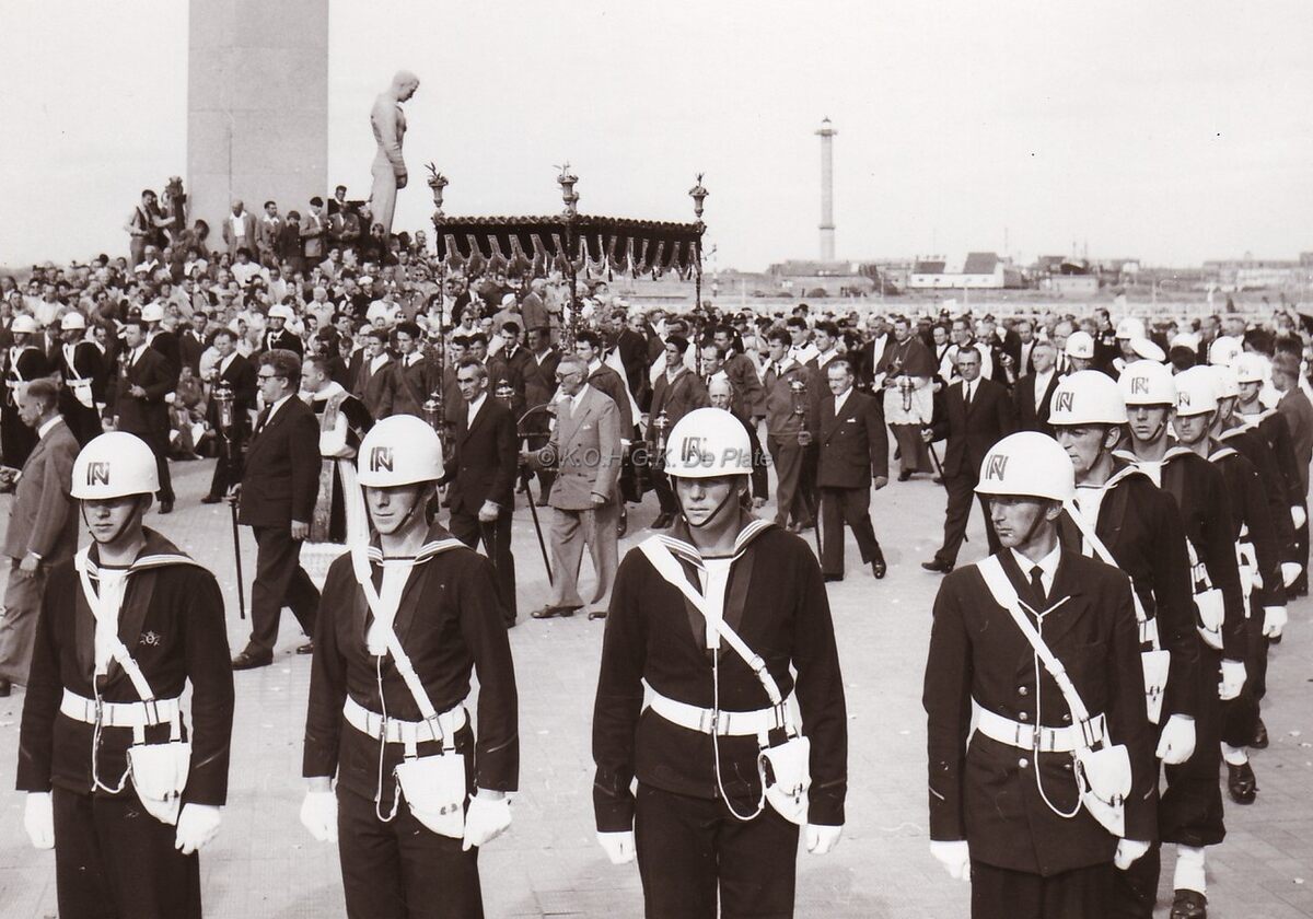 Een detachement N.P. (Naval Police) van de Zeemacht op het Zeeheldenplein tijdens de jaarlijkse Zeewijding.De monstrans (onder het baldakijn) komt aan op het Zeeheldenplein waar de zegening der zee zal gebeuren.