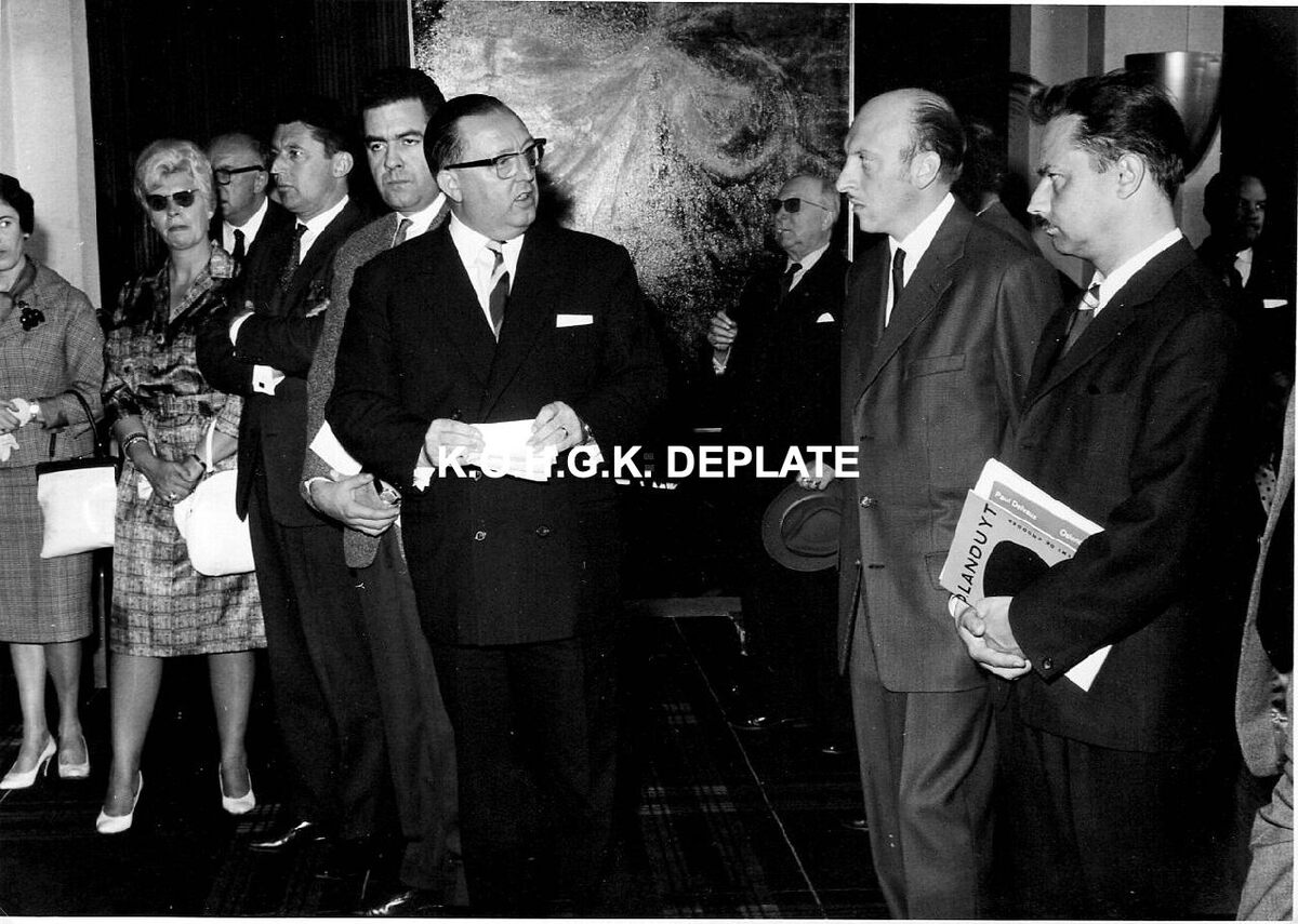 Formaat : 13 x 18 cm. - De vernissage op 28/06/1962. Ingeleid door schepen John Lauwereins. Tweede van rechts, de kunstenaar. Naast de mevrouw met de donkere bril, gemeenteraadslid Marcel Friederichs.