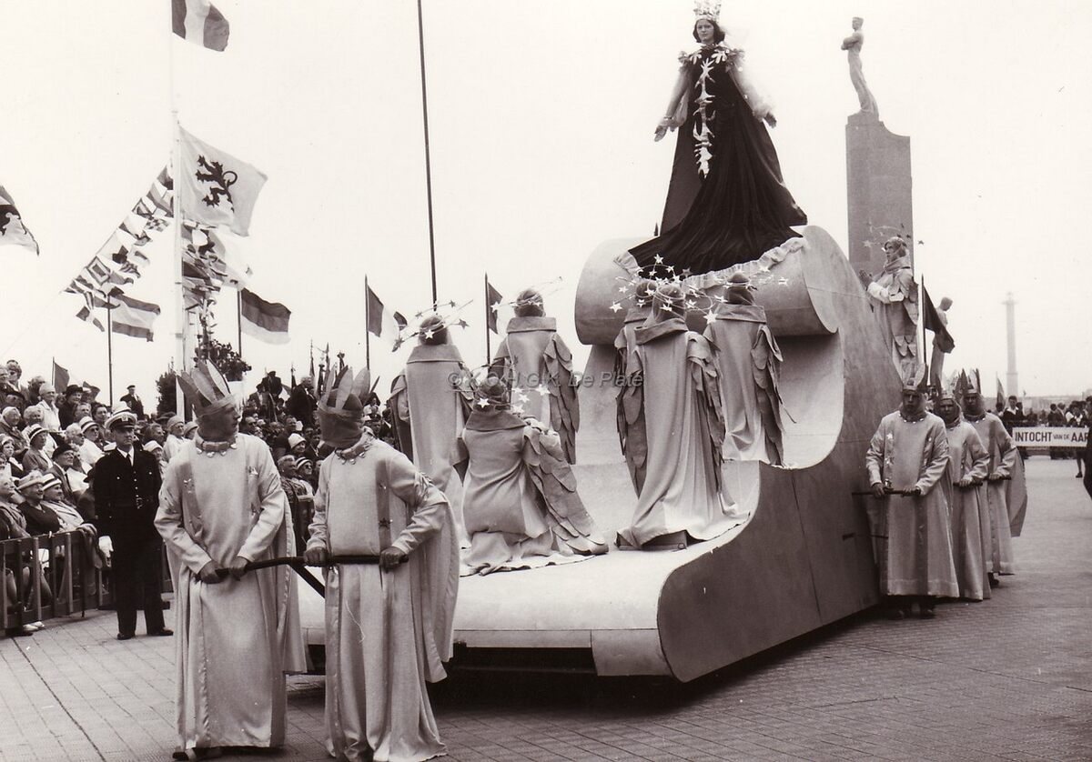 Een praalwagen uit de Zeewijding aan het Monument der Zeelieden op het Zeeheldenplein.Op de achtergrond de "Lange Nelle" (vuurtoren).
