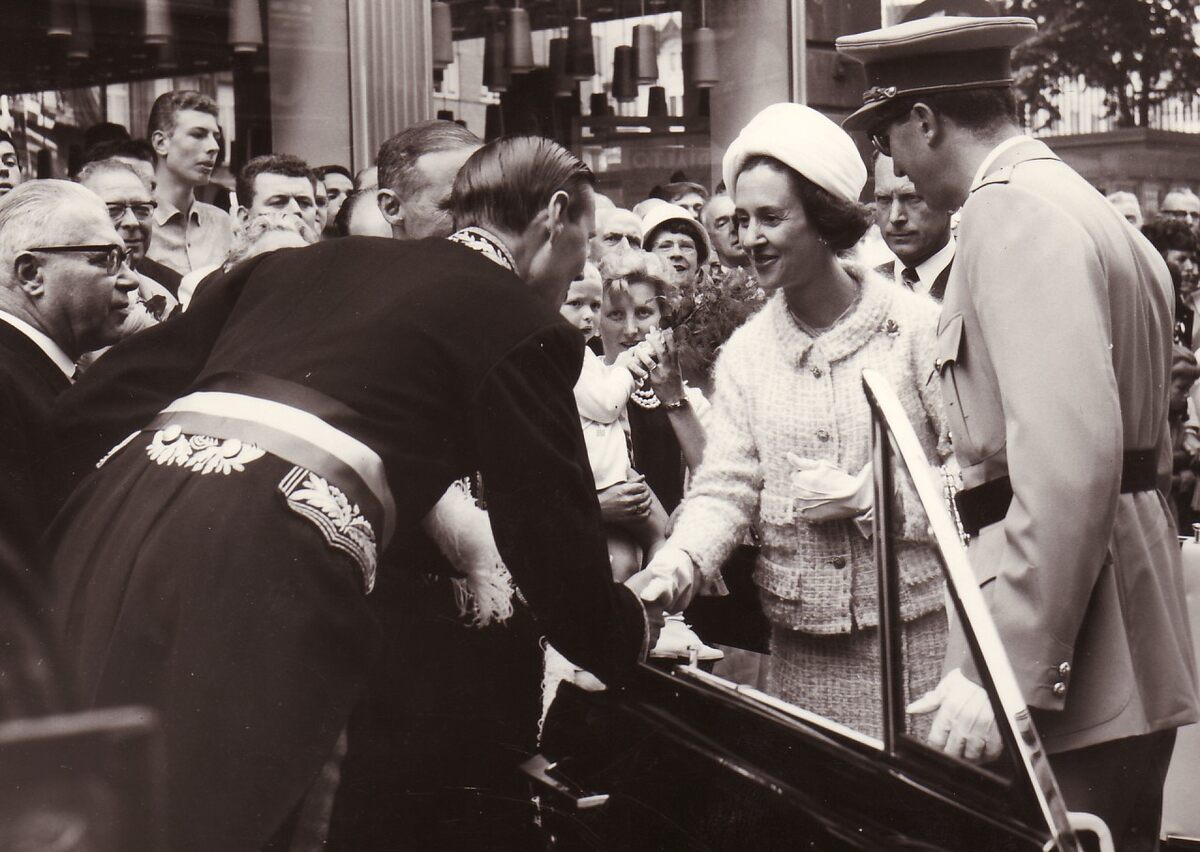 Formaat : 13 x 18 cm. - Burgemeester Jan Piers begroet Koning Boudewijn en Koningin Fabiola in de Adolf Buylstraat tijdens hun bezoek aan Oostende.