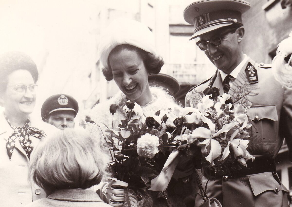 Formaat : 13 x 18 cm. - Koning Boudewijn en Koningin Fabiola worden door een lokaal meisje in de bloemen gezet in de Adolf Buylstraat.