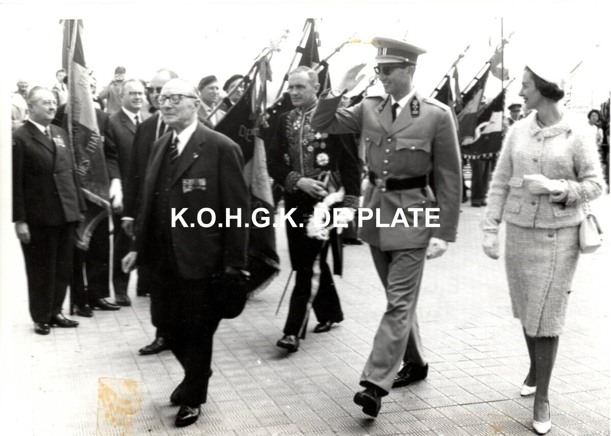 Formaat : 13 x 18 cm. Koning Boudewijn en koningin Fabiola op weg naar de tribune op het Zeeheldenplein voor het bijwonen van de Zeewijding en Ommegang. Zij begroeten de vaderlandslievende verenigingen met hun vlaggen. We herkennen ook achter de koning provinciegouverneur Pierre Van Oytryve d'Ydewalle.
