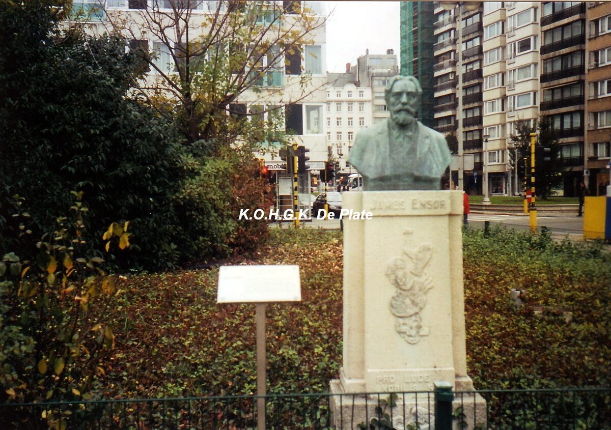 Formaat : 15 x 10 cm. - Het James Ensor-monument in het Leopoldpark. Replica in brons door Irenée Duriez in 1985. Het origineel werd gemaakt door de Brusselse beeldhouwer Edmond De Valériola in marmer en werd in 1930 officieel ingehuldigd in het kursaal plantsoen.