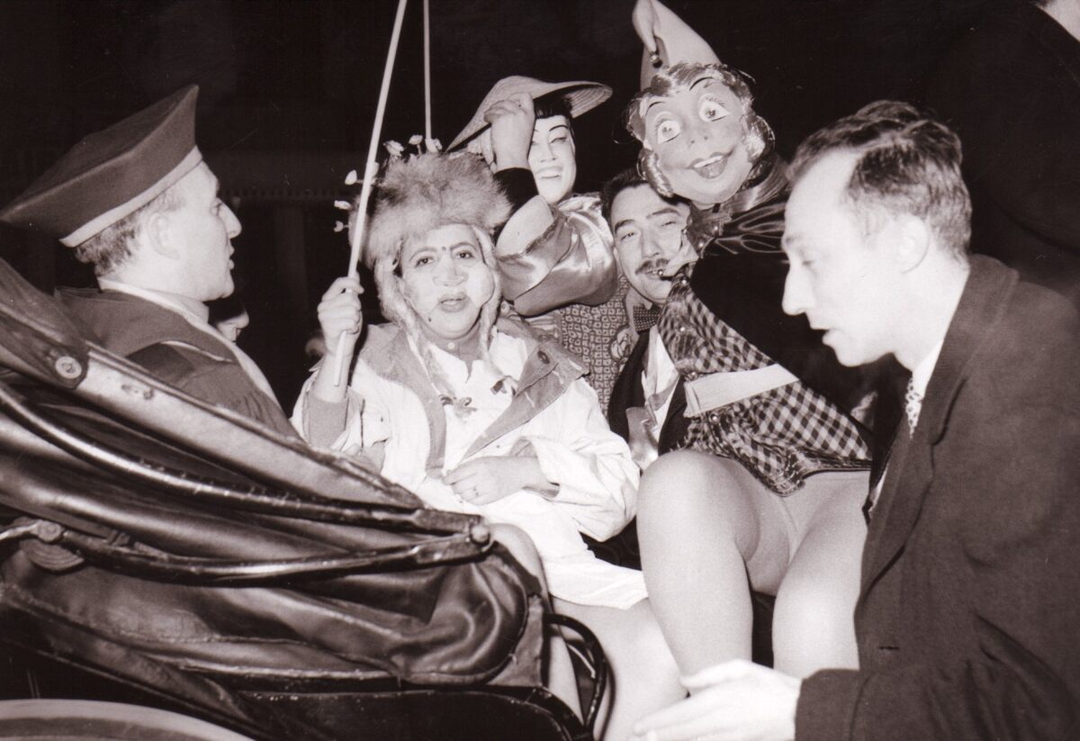 Schepen Roger DE KINDER, met snor, in een open koets, in de verdrukking tijdens een cimateirestoet. Feestdirecteur Fred RIGAUX (rechts) tracht hem te ontzetten.