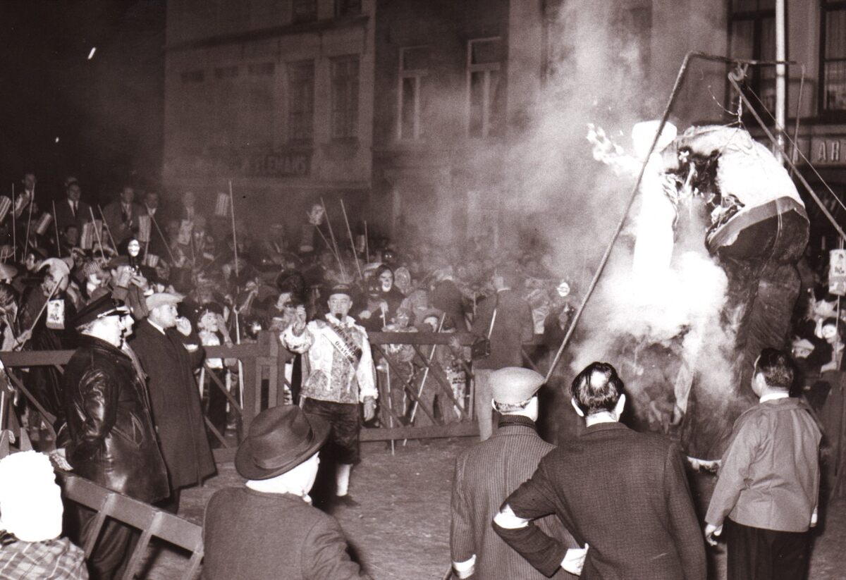 Verbranden van "Tjannie Carbon", een stropop na afloop van de cimateirestoet in het Visserskwartier.