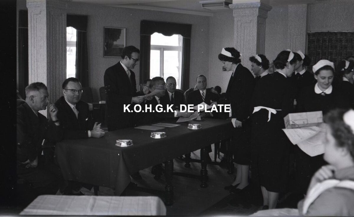 Foto : Opdiensters en hulpkokkinnen ontvangen hun diploma na het volgen van een herscholingscursus. Hotel Wellington. 29/03/1957