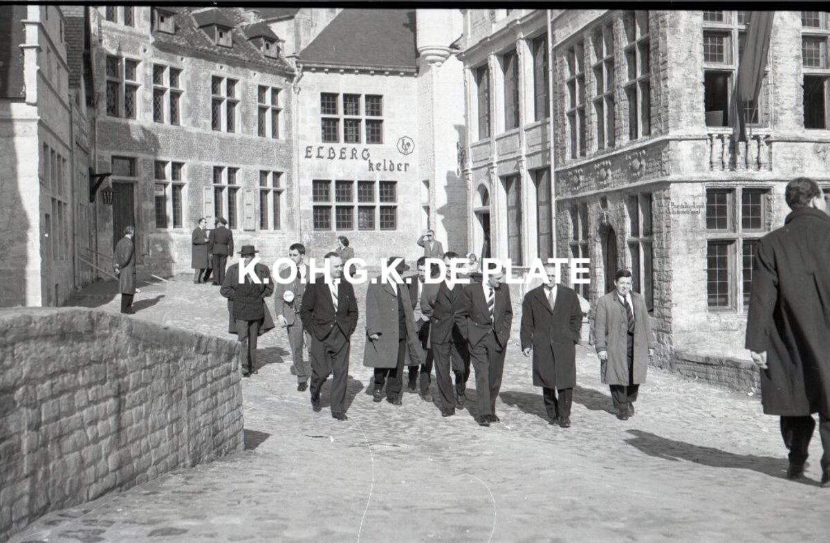 Negatief : 6 x 9 cm. - Bron : Het Kustblad 02/04/1958. - Bezoek onder de leiding van schepen Frans Van Caillie. De delegatie in het folkloristisch dorp "Vrolijk België". We zien hen op het plein "De Zoeten Inval" en rechts, detail van het Brusselse gebouw "Le Cheval Marin".