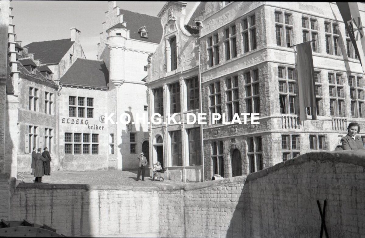 Negatief : 6 x 9 cm. - Het folkloristische dorp "Vrolijk België". We zien het plein "De Zoeten Inval", en rechts, het Brusselse gebouw "Le Cheval Marin".