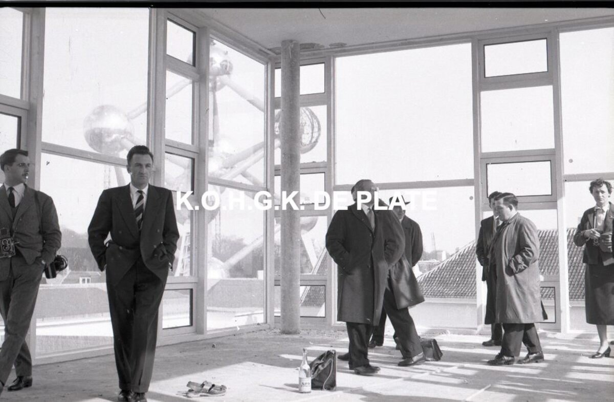 Negatief : 6 x 9 cm. - Interieur van het Oostends paviljoen in opbouw en op de achtergrond, het Atomium.