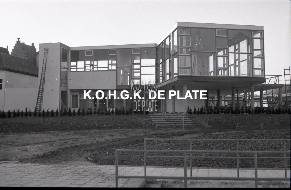 Negatief : 6 x 9 cm. - Het Oostends paviljoen in opbouw.