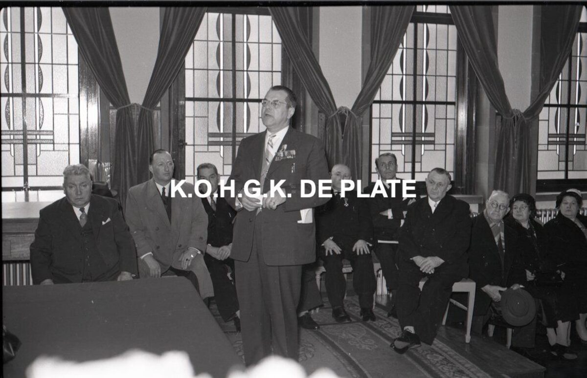 Negatief : 6 x 9 cm. - Plechtige ontvangst op het stadhuis. Vooraan, voorzitter Pierre Beauprez. Hij was ook hoofdpolitiecommissaris van de stad Oostende.