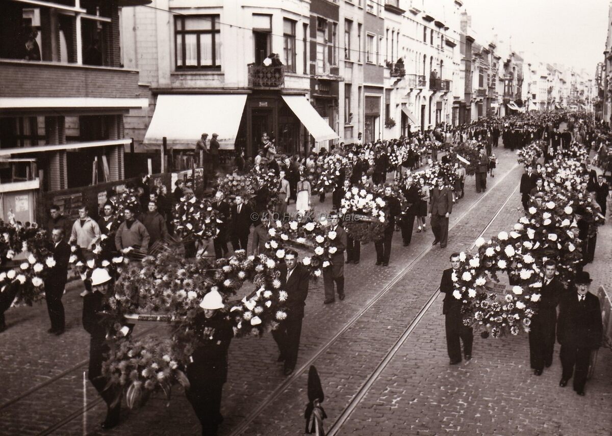 De begrafenisstoet passeert op de Nieuwpoortsesteenweg, ter hoogte van de Maria-Theresiastraat (links), en op de achtergrond het kruispunt Petit Paris.