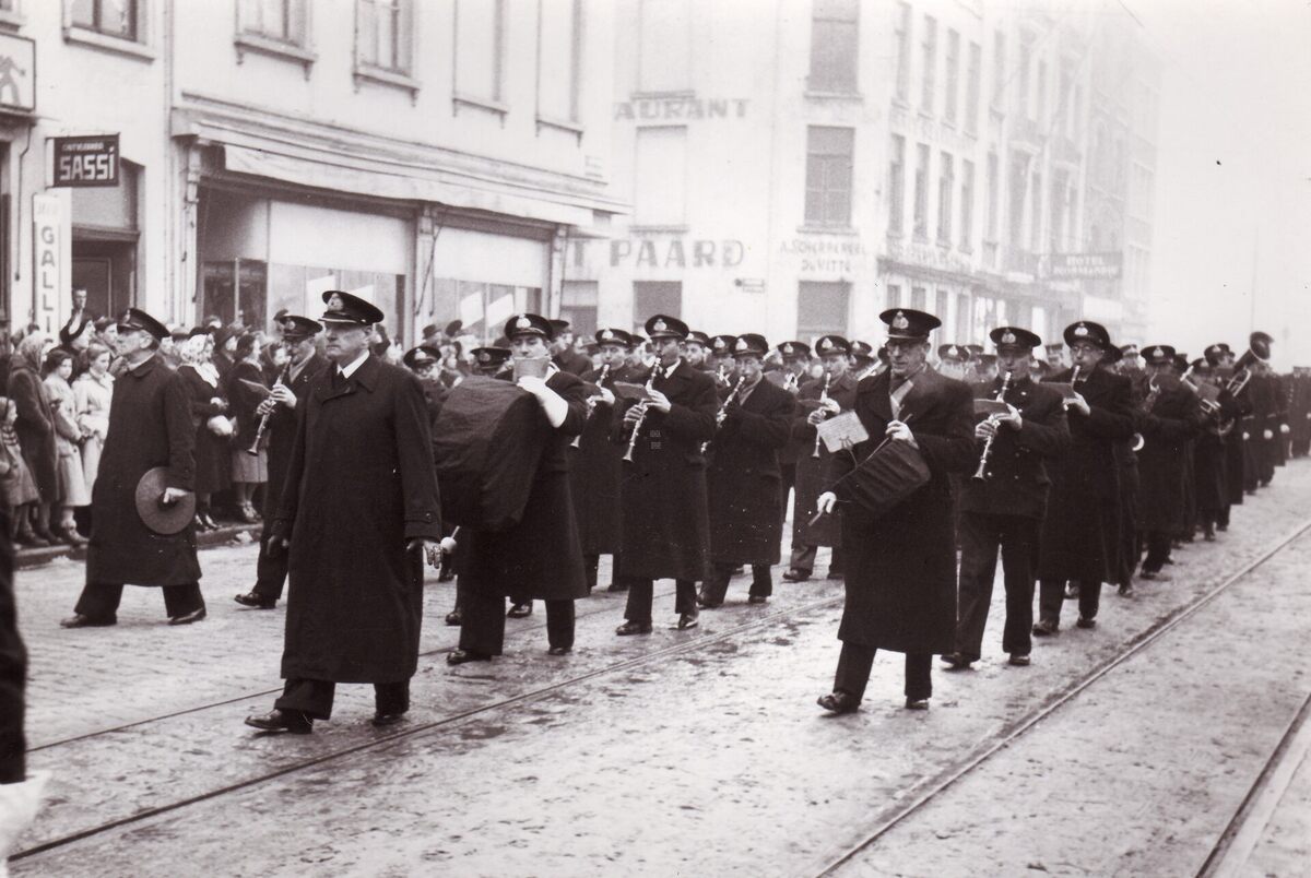 Formaat : 13 x 18 cm. - De lijkkist van burgemeester Henri Serruys op de Vindictivelaan rechtover de plaats van het stadhuis