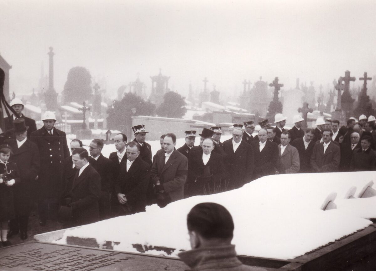 Formaat : 13 x 18 cm. - De begrafenisstoet van burgemeester Henri Serruys aan de familiegrafkelder op het kerkhof aan de Nieuwpoortsesteenweg waar de overledene zopas is bijgezet.