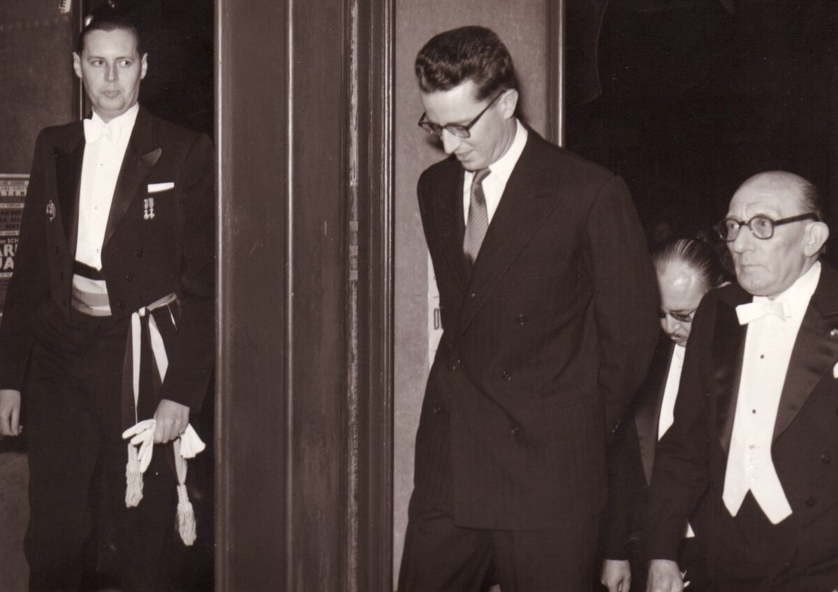Formaat : 13 x 18 cm. - Koning Boudewijn woonde de slotvoorstelling bij van het Koninklijk Landjuweel in de Koninklijke Schouwburg (Van Iseghemlaan). We zien hem in het gezelschap van burgemeester Jan Piers (links) en de voorzitter Paul Van Aerden