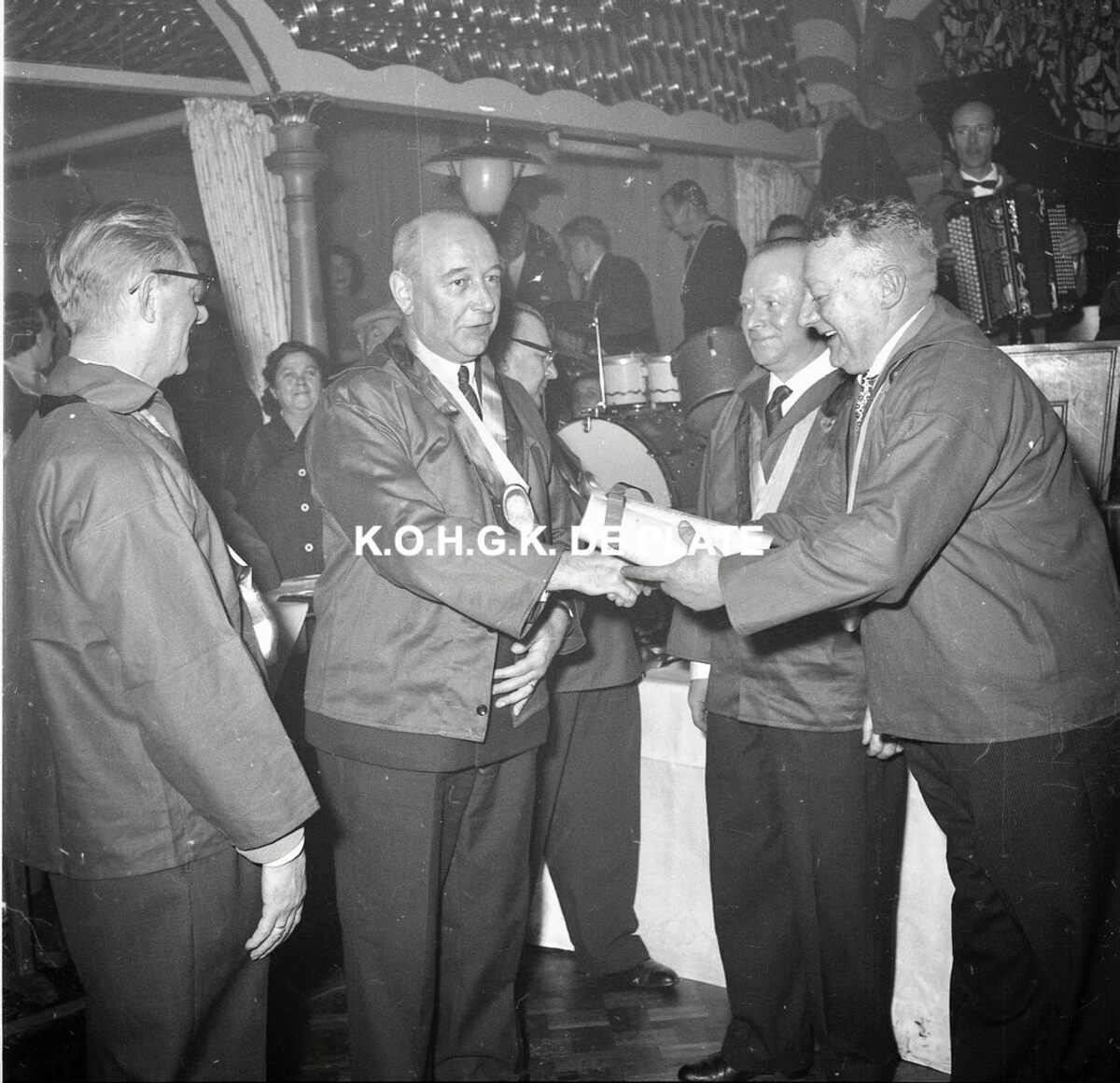 Negatief : 6 x 5,5 cm. - Schepen Kamiel Dehouck wordt lid van de "Orde van de Kloeffe". Rechts, Fernand Monteny. Dit gebeurde in dancing Carnegie.