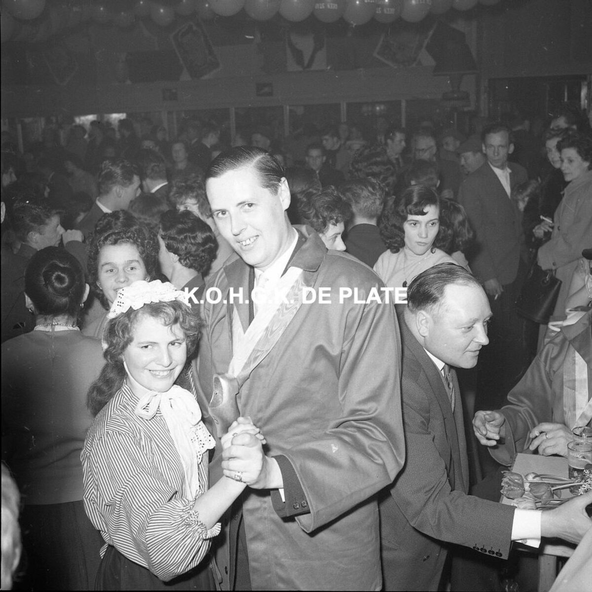 Negatief : 6 x 5,5 cm. - Burgemeester Jan Piers was er altijd graag bij. Hier op het Kloeffebal in dancing Carnegie.
