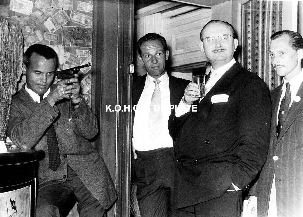 Formaat : 13 x 18 cm. - Harry Belafonte in het gezelschap van o.a. Roger De Ramée, directeur van het Kursaal (tweede van rechts)