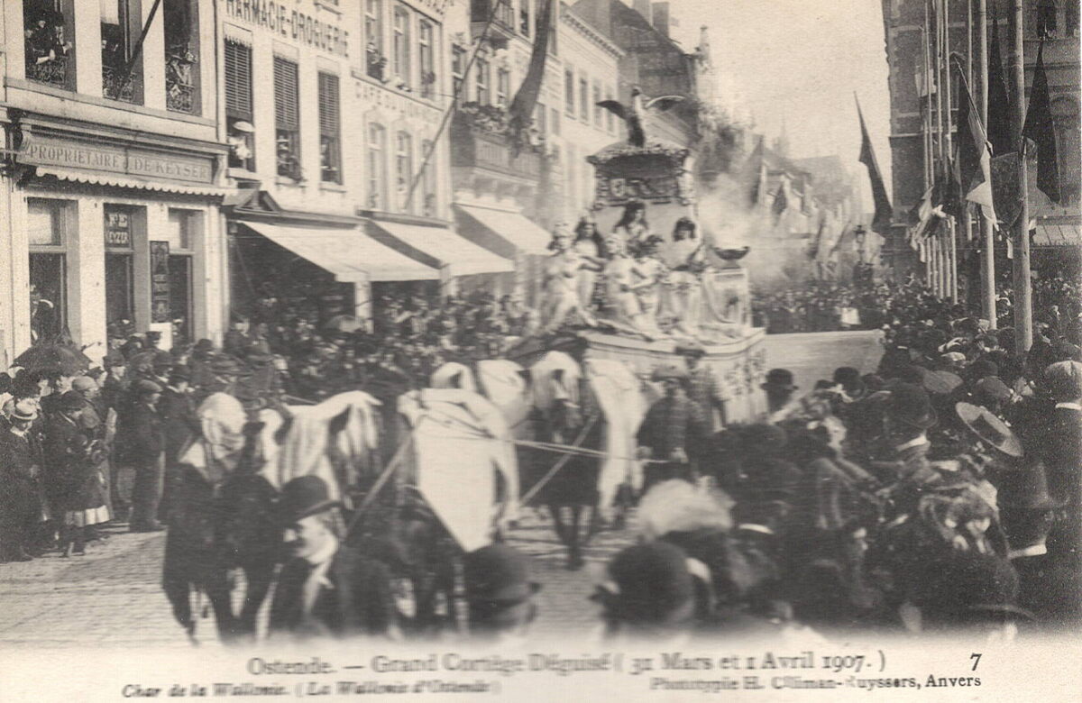 Formaat : 9 x 14,5 cm. - Phototypie H. Climan-Ruyssers, Anvers, N° 7. - Ostende - Grand Cortège Déguisé (31 Mars et 1 April 1907). - Char de la Wallonie ( La Wallonie d'Ostende). - Hier met hun praalwagen op het Wapenplein