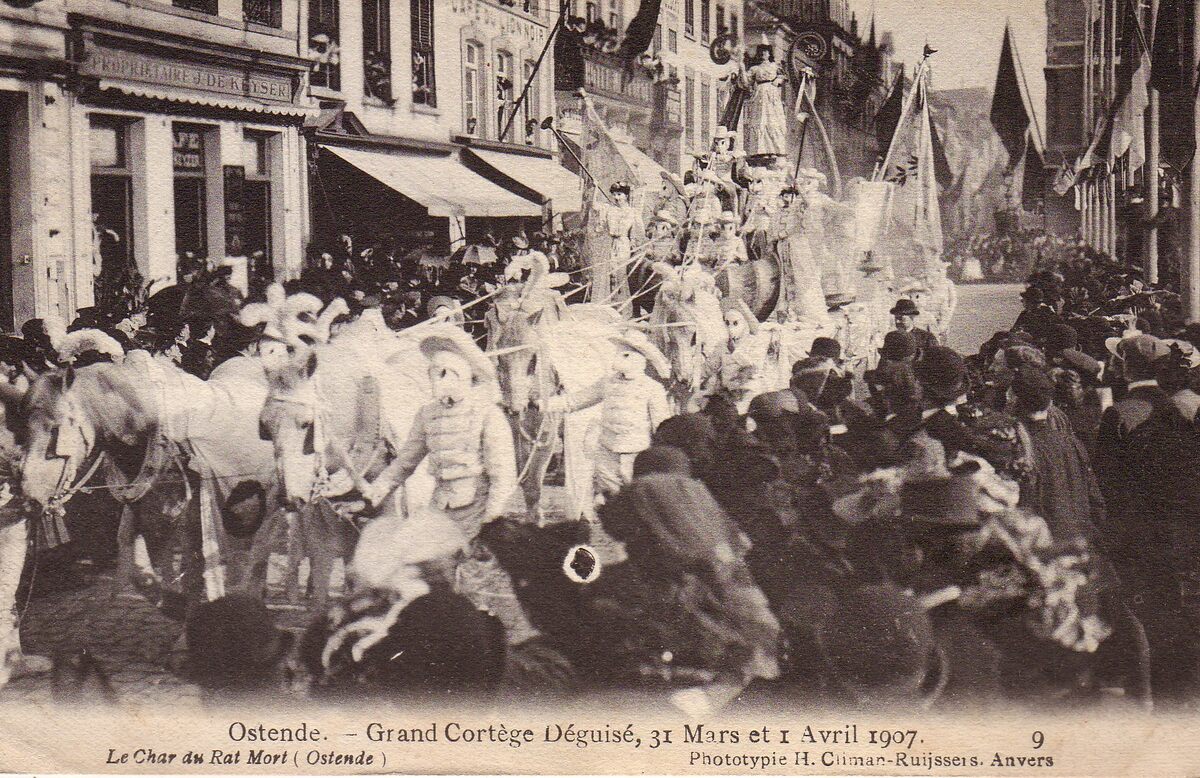 Phototypie H.Climan-Ruijssers. Anvers, N° 9. - Grand Cortège Déguisé, 31 Mars - 1 Avril 1907. Le char du Rat Mort (Ostende). - De praalwagen van de confrerie "Rat Mort" van de "Cercle Coecilia" op het Wapenplein.