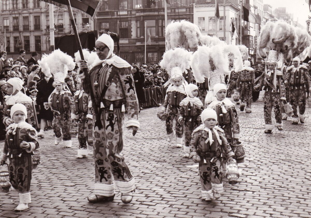 Foto : Carnavalstoet 1957. 1e Rattestoet. Les Gilles Saint Gillois uit Sint Gillis op het Wapenplein