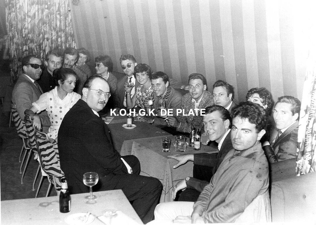 Formaat : 13 x 18 cm. - Met Catherine Sauvage, Guy Béart, Raymond Devos, Erik Montry, Lafleur, Nadine Claire, Rosita, Les Cinq Pères. "Le Théâtre des Trois Baudets", gelegen in Pigalle (Parijs). Gecreëerd op het einde van de jaren veertig door Jacques Canetti om jonge artisten een kans te geven. Zij traden op in de concertzaal. Hier in de nightclub "La Champagne", met vooraan links, Roger De Ramée, directeur van het Kursaal en onder voorbehoud, naast hem Catherine Sauvage. Vooraan, Guy Bejart. Op de achterste rij, derde van rechts, Raymond Devos
