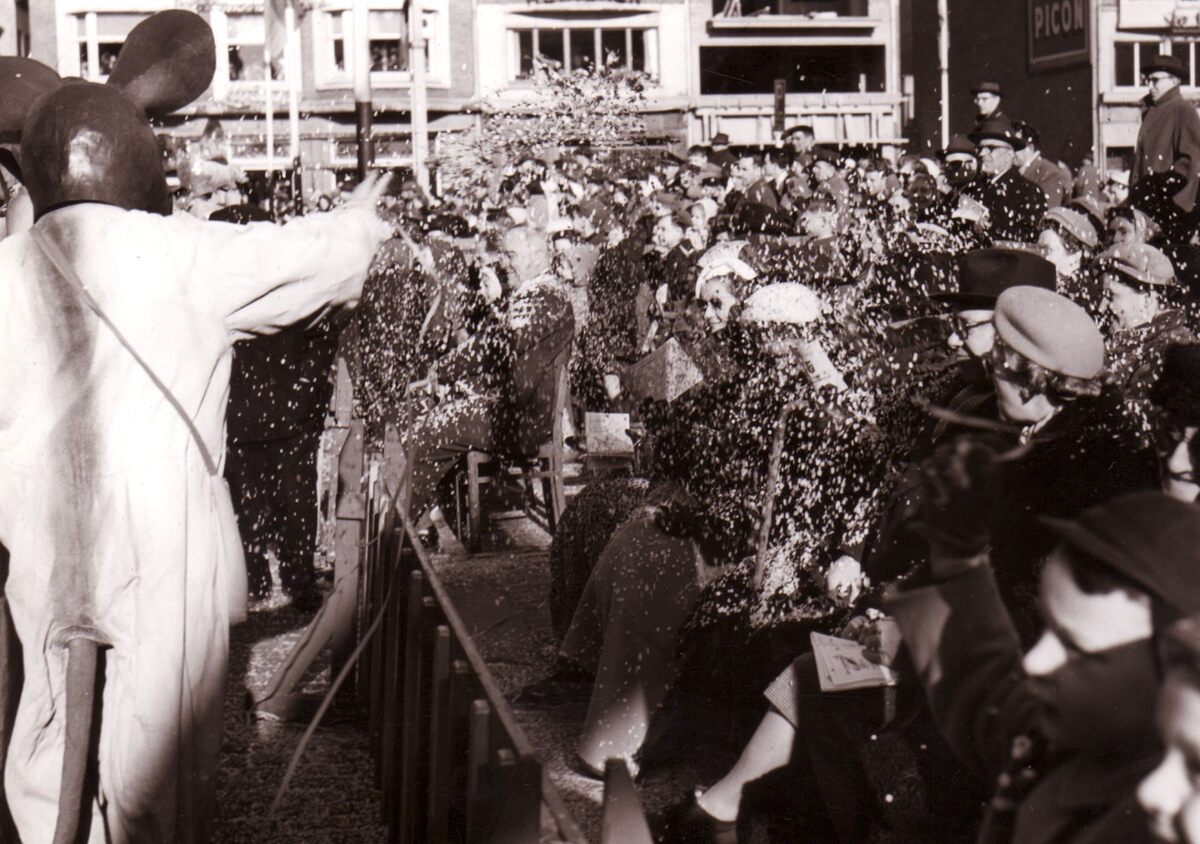 Het publiek krijgt de volle lading (confetti) bij het voorbijtrekken van de Carnavalstoet op het Wapenplein.