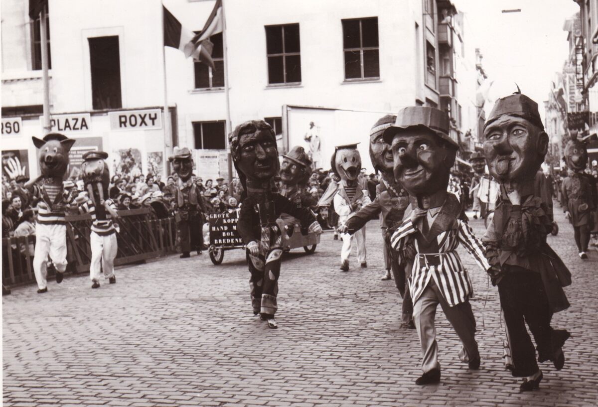 Carnavalstoet op het Wapenplein tegen hoek Kapellestraat.Achtergrond het feestpaleis in opbouw.