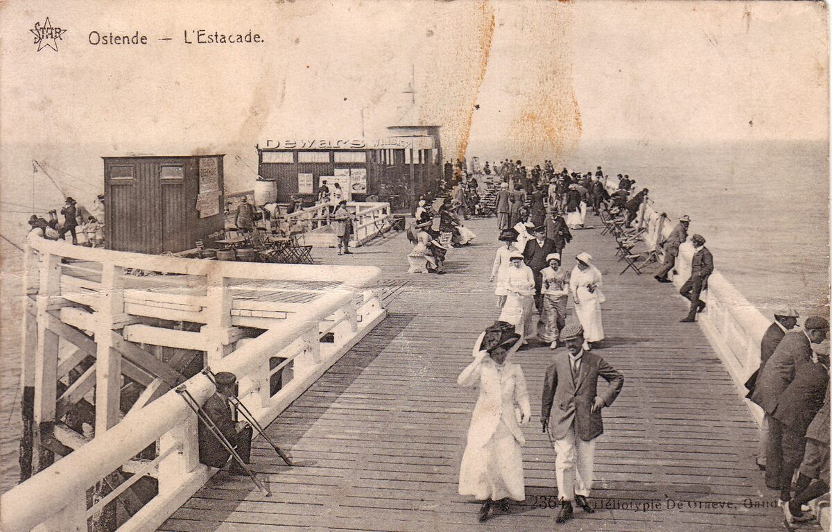 Star, N° 2364. - Ostende - L'Estacade. - We zien het einde van het Weststaketsel, of "'t koptje van 't hoofd". Er was ook op het einde een café-paviljoen waar je een drankje kon nuttigen en genieten van de gezonde zeelucht. Het was voor de toeristen en Oostendenaars een favoriete wandelroute. Vooraan links, een gehandicapte man met krukken. Met de renovatie van de havengeul en het bouwen van de strekdammen is ook het café-paviljoen verdwenen.