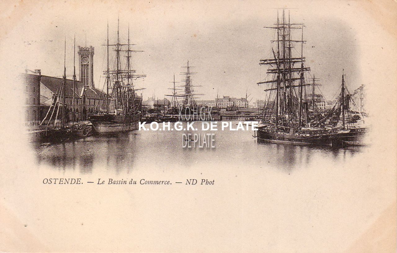 [Neurdein], ND Phot., nr.23. - Ostende - Le Bassin de Commerce. - Vrachtschepenen vissersvaartuigen in het Eerste Handelsdok. Links, de stedelijke opslagplaatsen langs de Keizerskaai. We zien ook de toren van het spoorwegstation