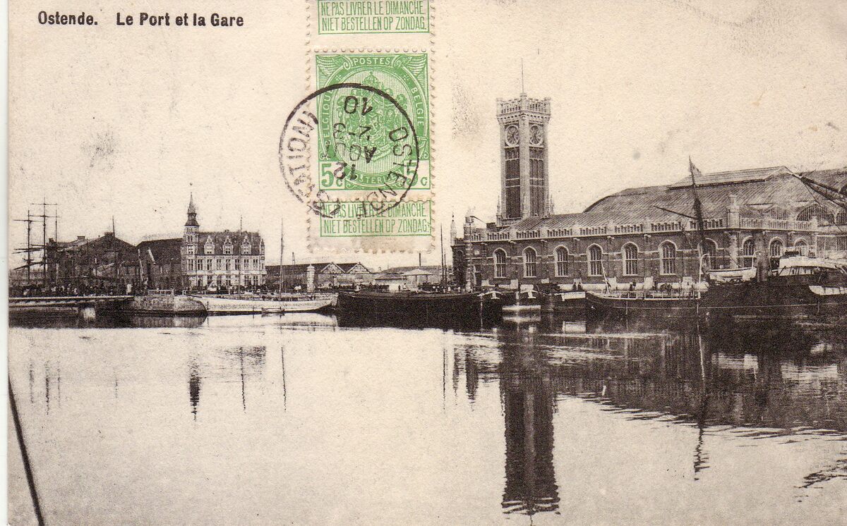 Le port et la gare. - Vooraan, het tweede handelsdok. Het tweede spoorwegstation (Oostende-Stad) gelegen langs de Keizerskaai. Vanaf oktober 1912, Stationskaai. Nu, de Leopold III-laan