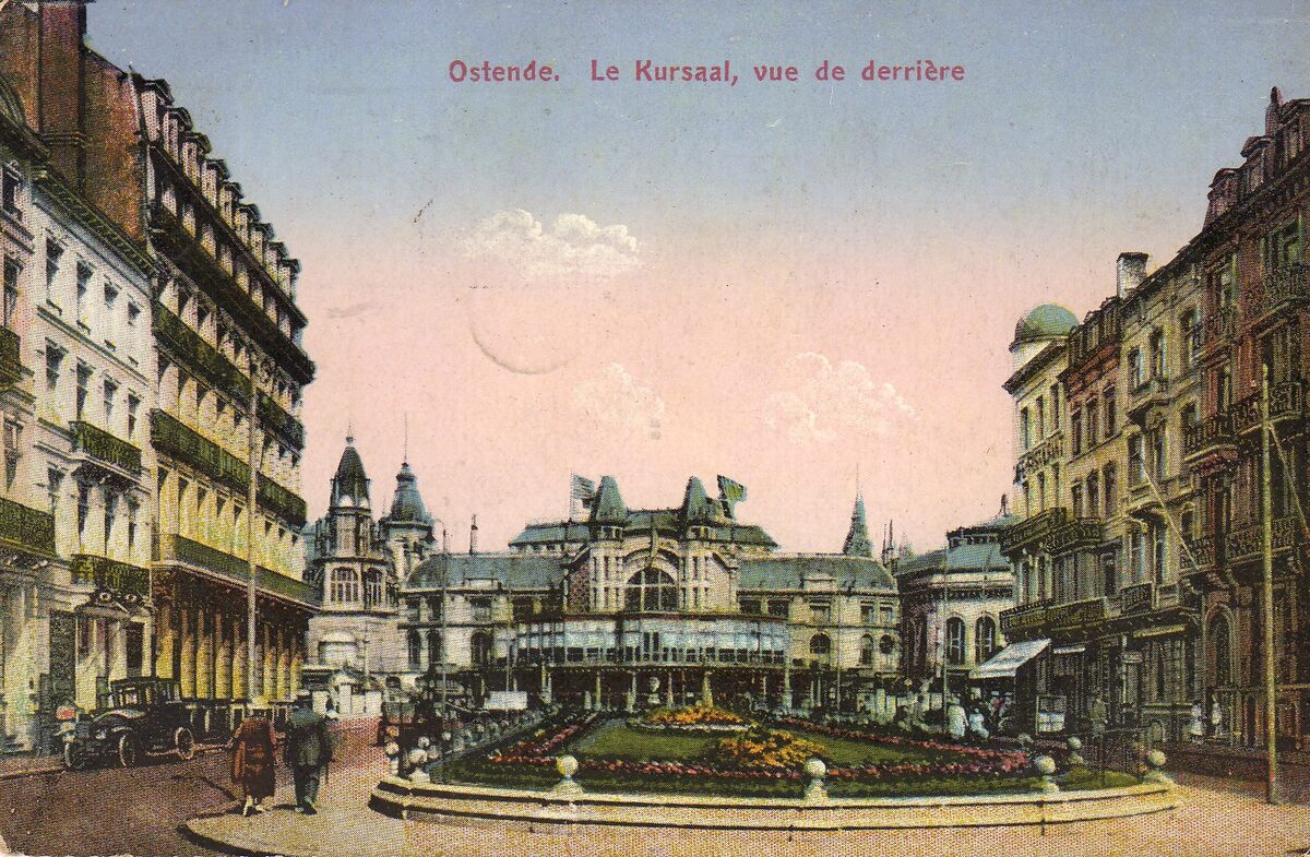Postkaart C.F. - Ostende - Le Kursaal, vue de derrière. - Bijgekleurde prentkaart. - De Leopoldlaan, gezien vanaf het Leopoldpark richting derde kursaal.