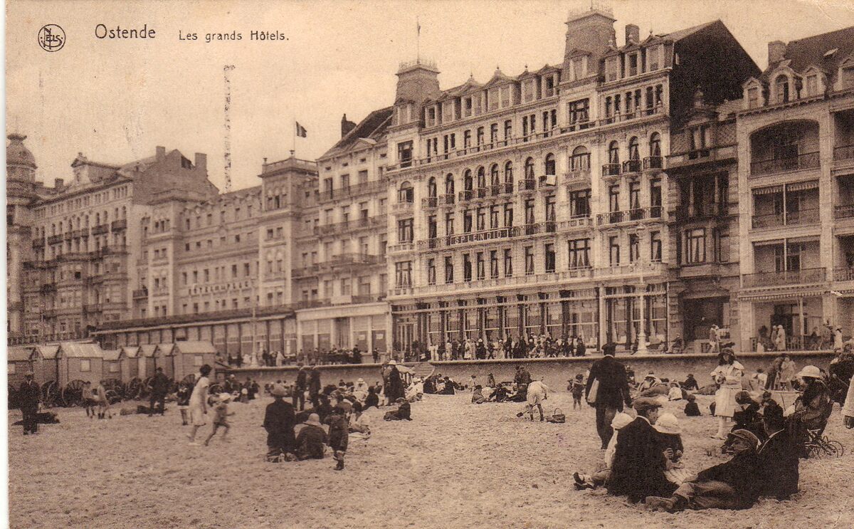 Nels. - Ostende - Les grands hôtels. - De Zeedijk ten westen van het derde Kursaal. Strandrecreatie op het Groot Strand. Van links naar rechts, Hôtel Continental, Hôtel de L'Océan, Hôtel de la Plage, Hôtel Beau Rivage en Hôtel Splendid