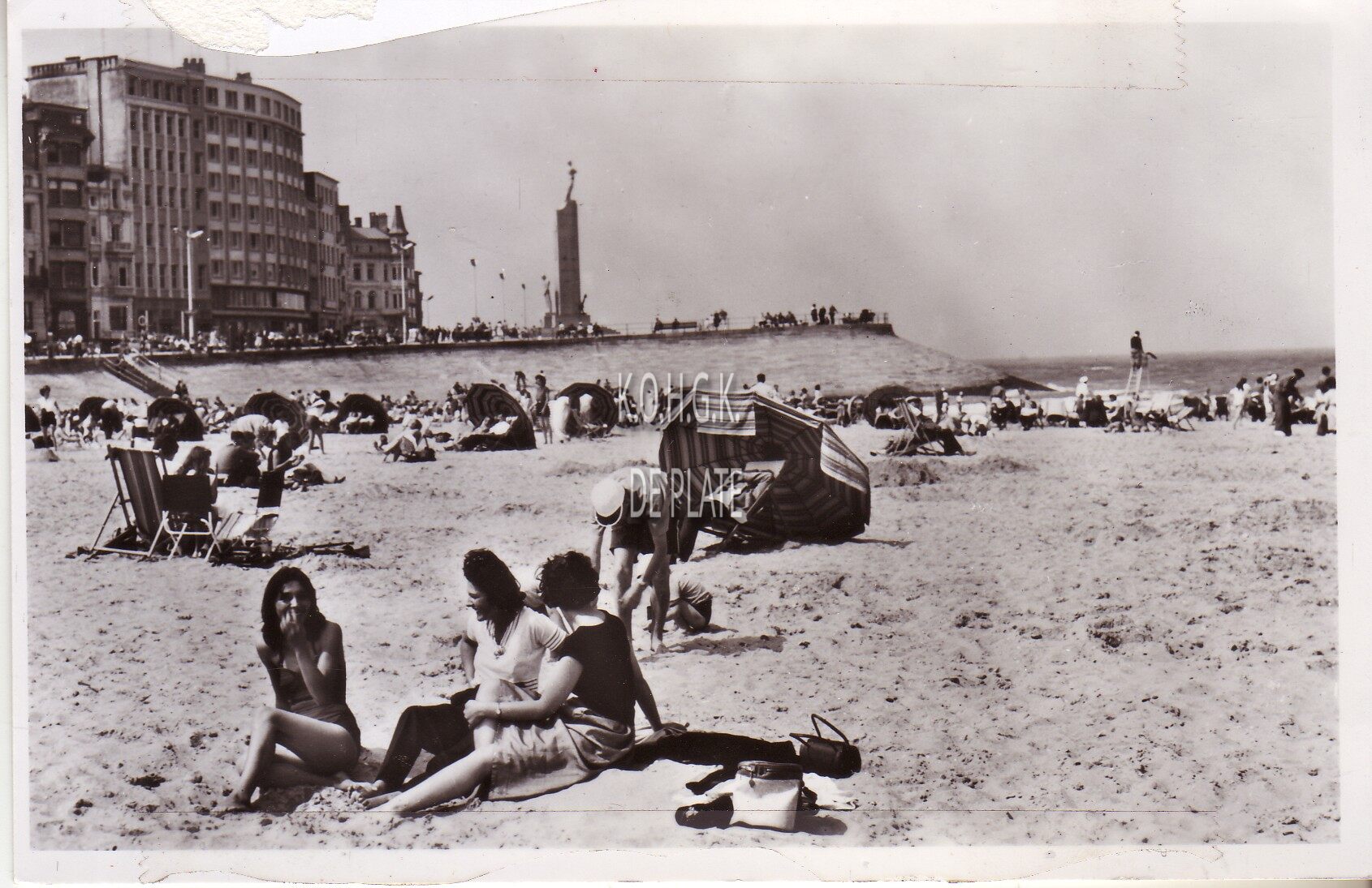 Postkaart Mess. - Het klein strand en buildings. - Strandrecreatie op het Klein Strand. Een strandredder is aanwezig. Op de achtergrond, de Albert I-promenade en op het Zeeheldenplein het "Monument der Zeelieden"