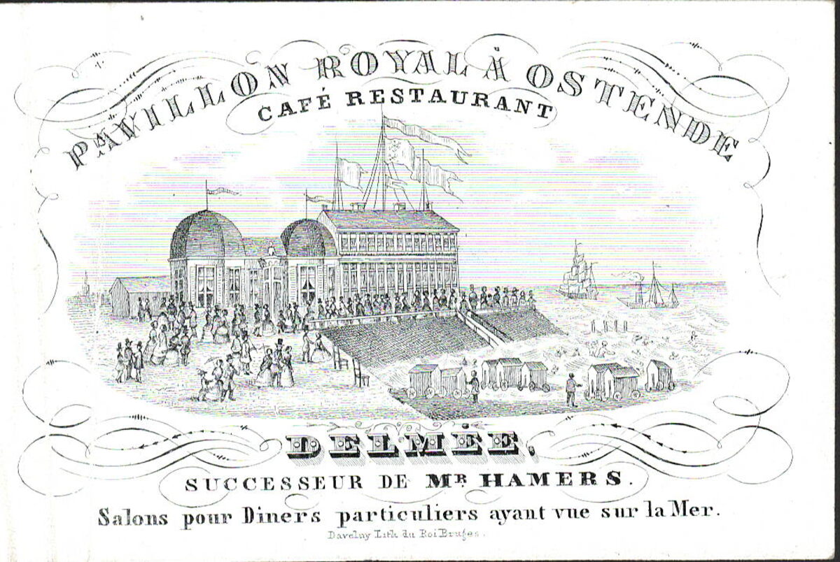 Formaat : 6 x 9,6 mm. - Pavillon Royal à Ostende. Café Restaurant. Delmée successeur de Mr Hamers. Salon pour Diners particuliers ayant vue sur la Mer. Sedert december 1851 wordt het "Pavillon Royal" uitgebaat door J.B. Delmée.