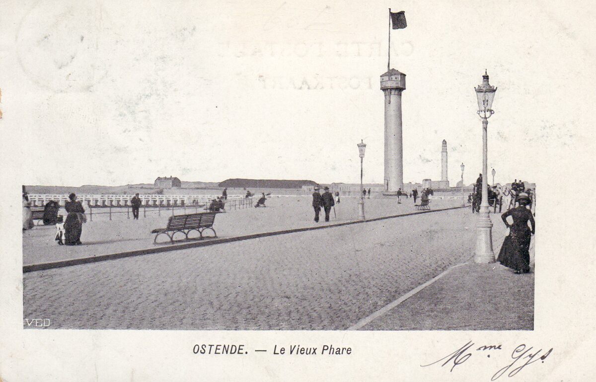 VED, [Imp. V. Ernult-Doncq, 20, rue des Chartreux, Bruxelles]. - Ostende - Le Vieux Phare. - De eerste vuurtoren, genaamd "De Vlaggestok", op de Zeedijk. Op de oosteroever zien we de tweede vuurtoren.