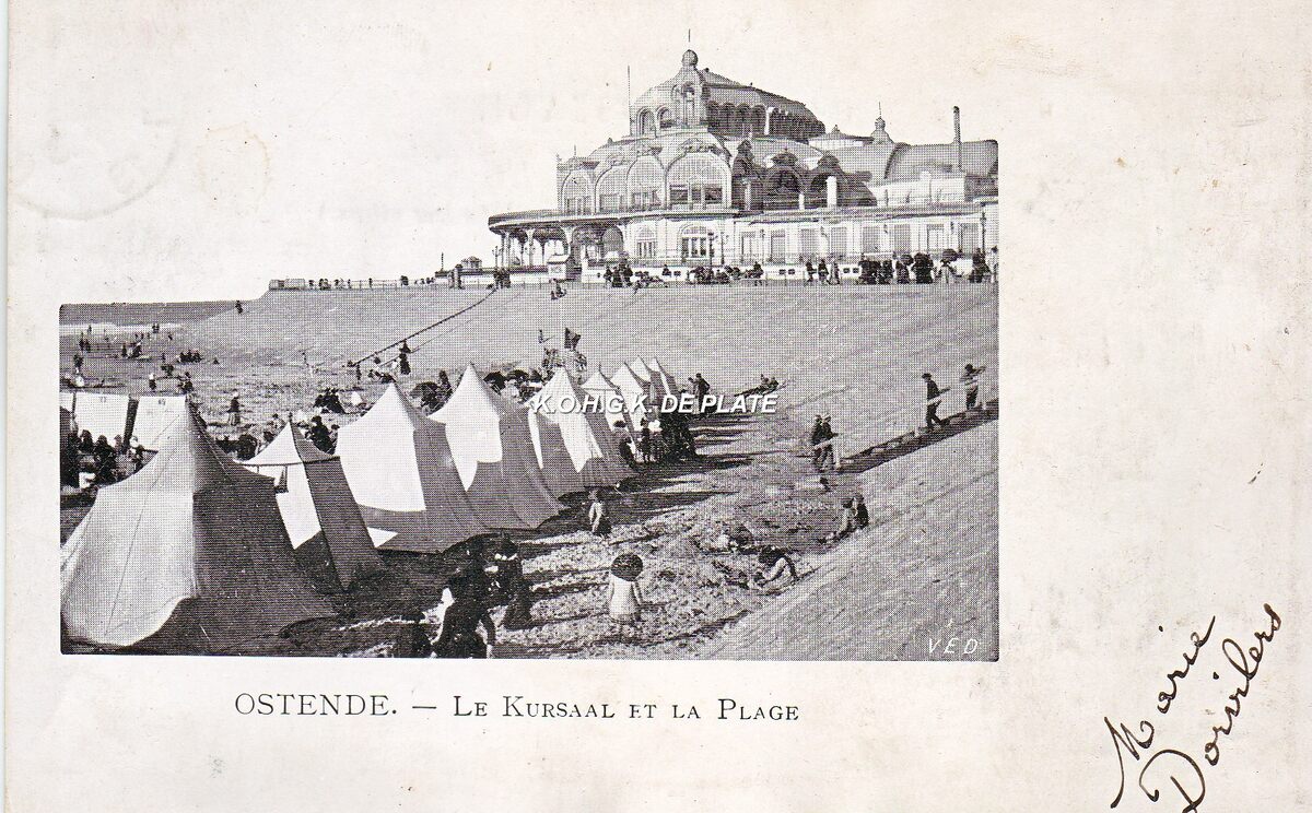 VED [Imp. V. Ernult-Doncq, 20, rue des Chartreux, Bruxelles]. - Ostende - Le Kursaal et la Plage. - Strandrecreatie op het Groot Strand en op de achtergrond, gedeelte van de westgevel van het tweede Kursaal