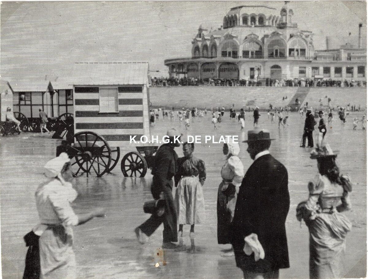 Foto (niet volledig) naar een postkaart van Le Bon, éditeur, Ostende. N°79. - Ostende - Bains à marée basse. - Formaat : 11 x 14,5 cm. - Oostende in de Belle Epoque. Strandrecreatie op het Groot Strand, met vooraan personeel van de badendienst. Op de achtergrond, de westgevel van het tweede Kursaal langs de Zeedijk