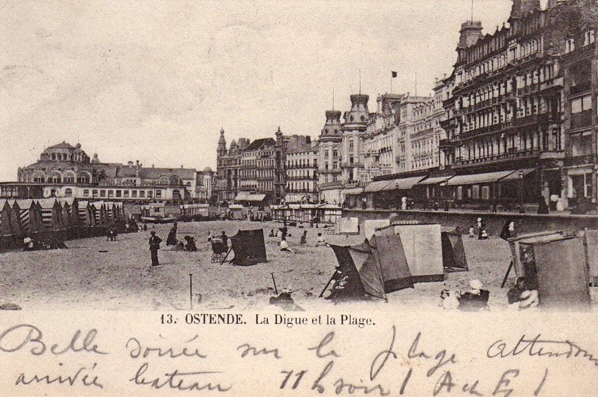 N° 13. - Ostende - La Digue et la Plage. - Strandrecreatie op het Groot Strand. Rechts, enkele strandtenten en links de traditionele badkarren. De Zeedijk met de grote hotels en de westelijke gevel van het tweede Kursaal