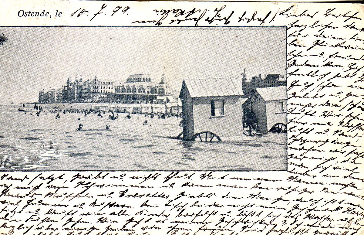 De traditionele badkarrren, met rechts het Groot Strand. We zien de tweede kurzaal en de oostzijde van de Zeedijk.