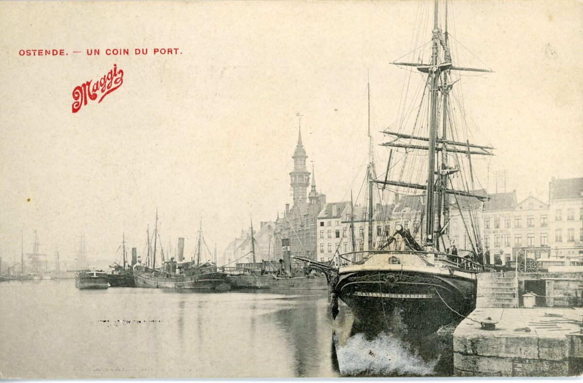 Op de achtergrond rechts de Keizerskaai, met op de hoek van de Zuidstraat, het Zeevaartcommissariaat of Pilotage.