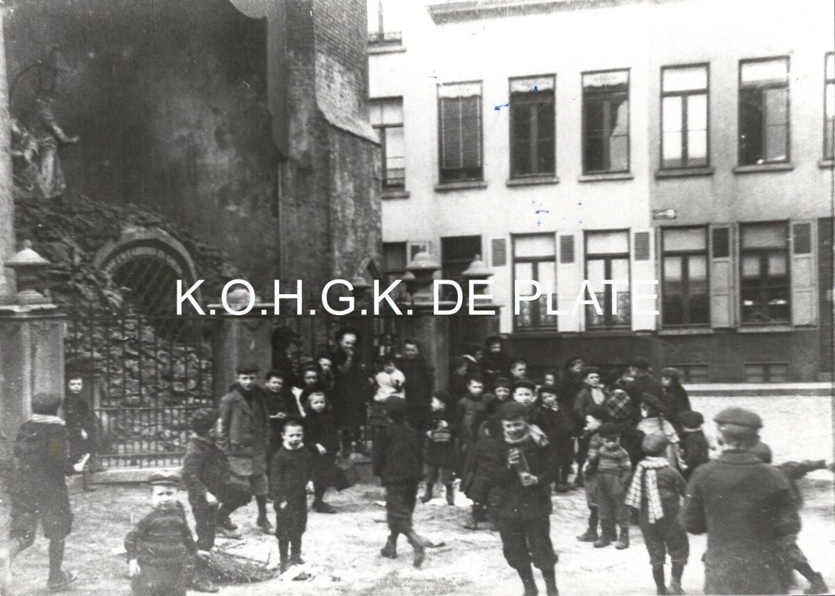 Formaat : 12,5 x 17,5 cm. - Het Vagevuur aan de voet van de oude toren van de Sint-Pieterskerk (bijgenaamd de Peperbusse). Op de achtergrond een gedeelte van de Sint-Pietersstraat. Vooraan spelende kinderen in de sneeuw