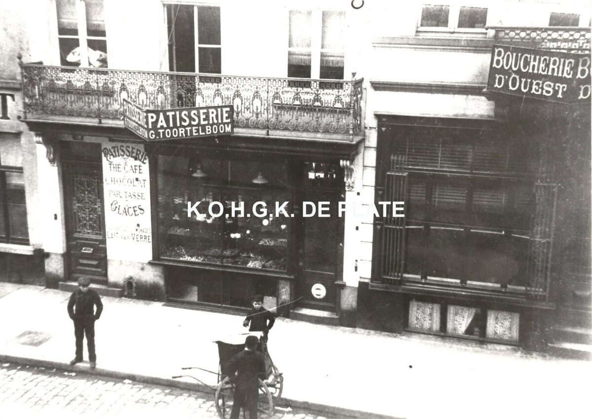 Formaat : 13 x 18 cm. - De patisserie van G. Toortelboom en rechts de Boucherie d'Ouest van D. Vandenberghe gelegen in de Weststraat, respectievelijk nummers 24 en 26