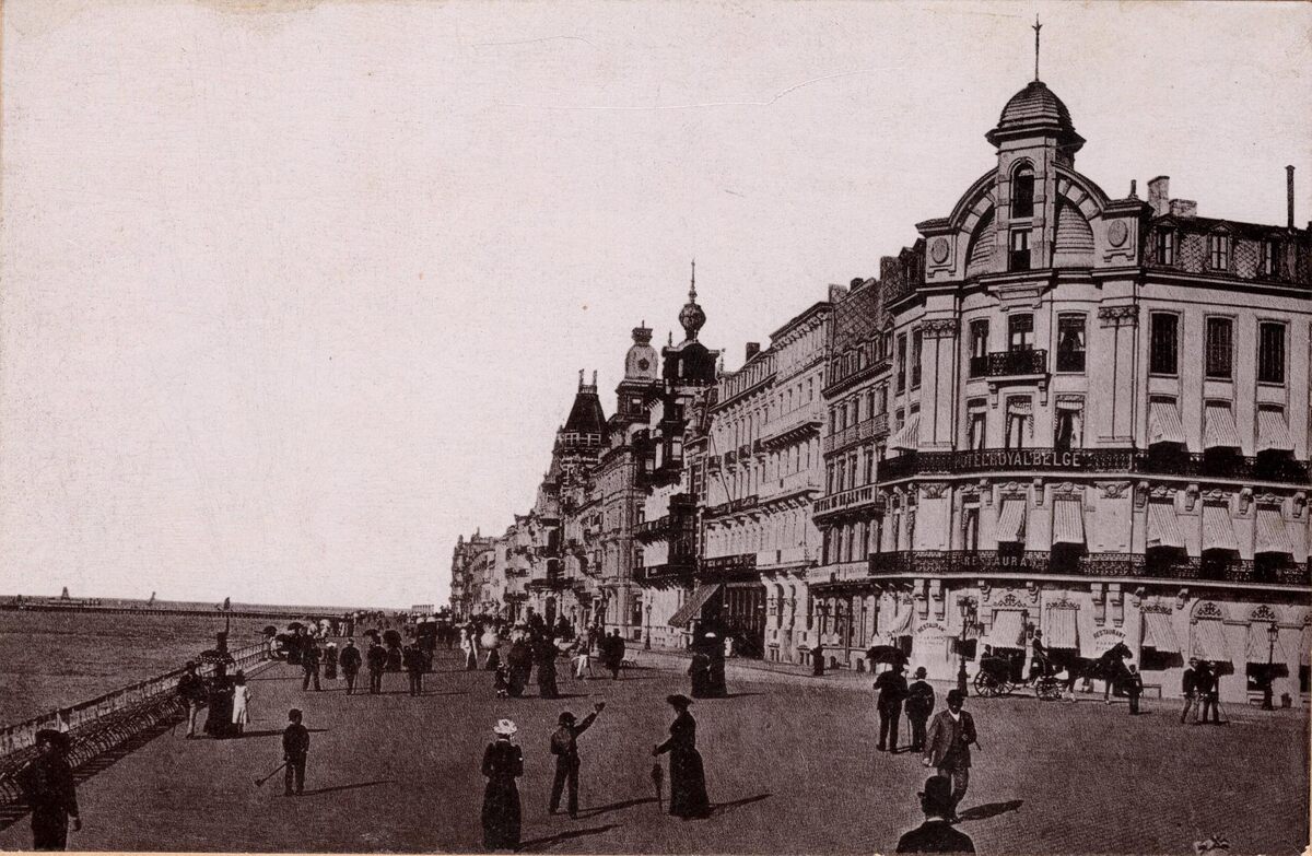 Formaat : 9,5 x 15 cm. - Fotokaart. N°4160. - Ostende - Digue de mer. - De Zeedijk, vanaf de Kursaal-Oosthelling richting havengeul. Op de hoek Hôtel Royal Belge.