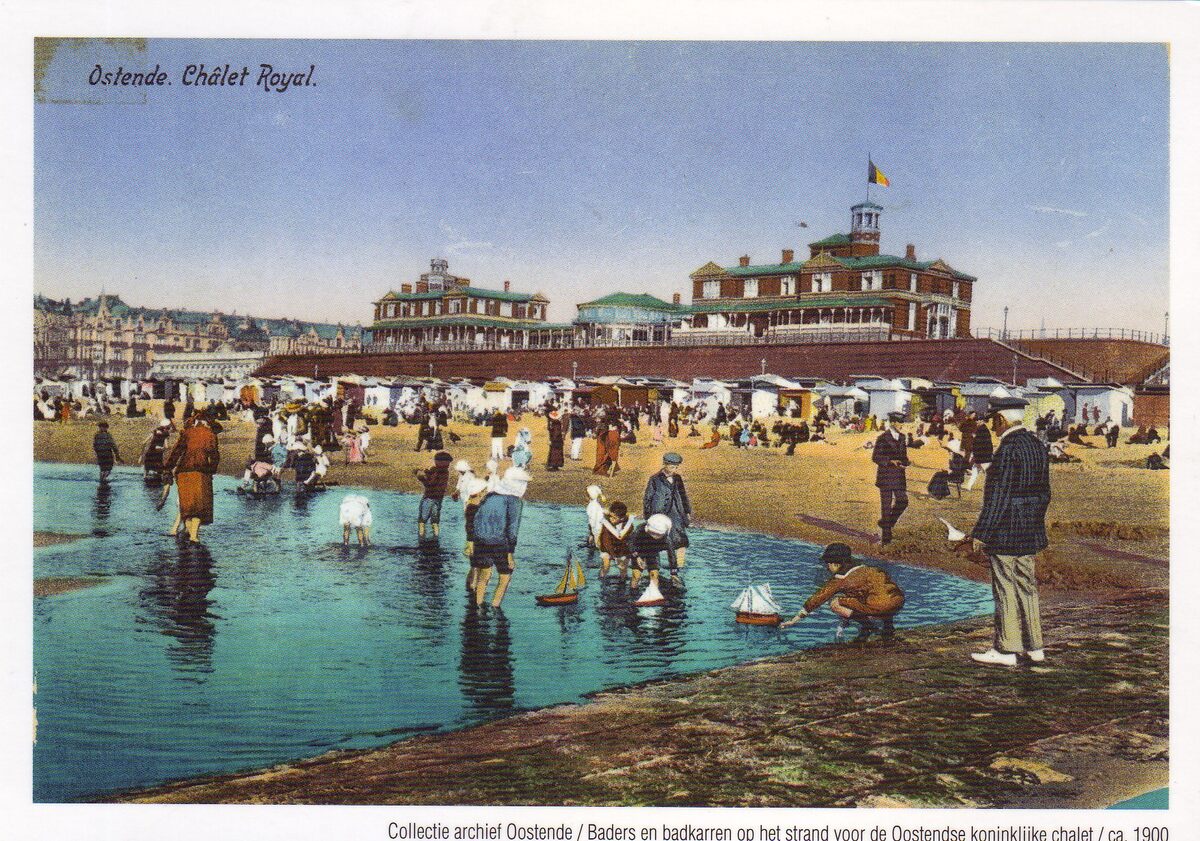 Postkaart, herdruk. - Collectie archief Oostende / Baders en badkarren op het strand voor de Oostendse koninklijke chalet. - Strandrecreatie op het Groot Strand. Op de achtergrond, het Koninklijk Chalet, langs de Zeedijk