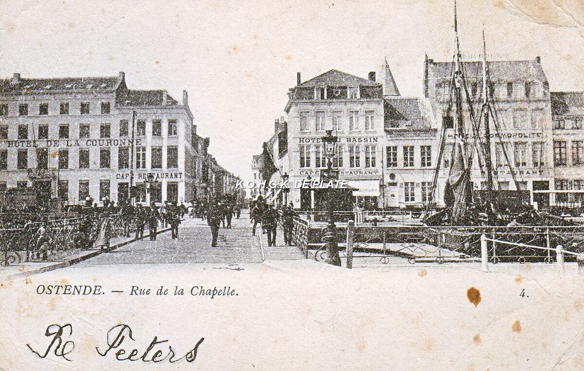 Th. Van den Heuvel. - Ostende - Rue de la Chapelle. - De Kapellestraat rechtdoor, vanaf de Kapellebrug. Langs de Keizerskaai enkele grote hotels.