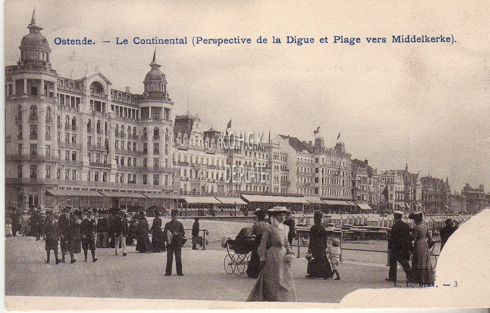 L.L. Brux, N° 3. [Lagaert]. - Ostende - Le Continental (perspective de la Digue et Plage vers Middelkerke). - De Zeedijk, ten westen van het Kursaal, richting het Koninklijk Chalet. Vooraan, het "Hotel Continental". Een vrouw op wandel met haar kinderwagen. Een man verkoopt kranten. Oostende in de Belle Epoque.