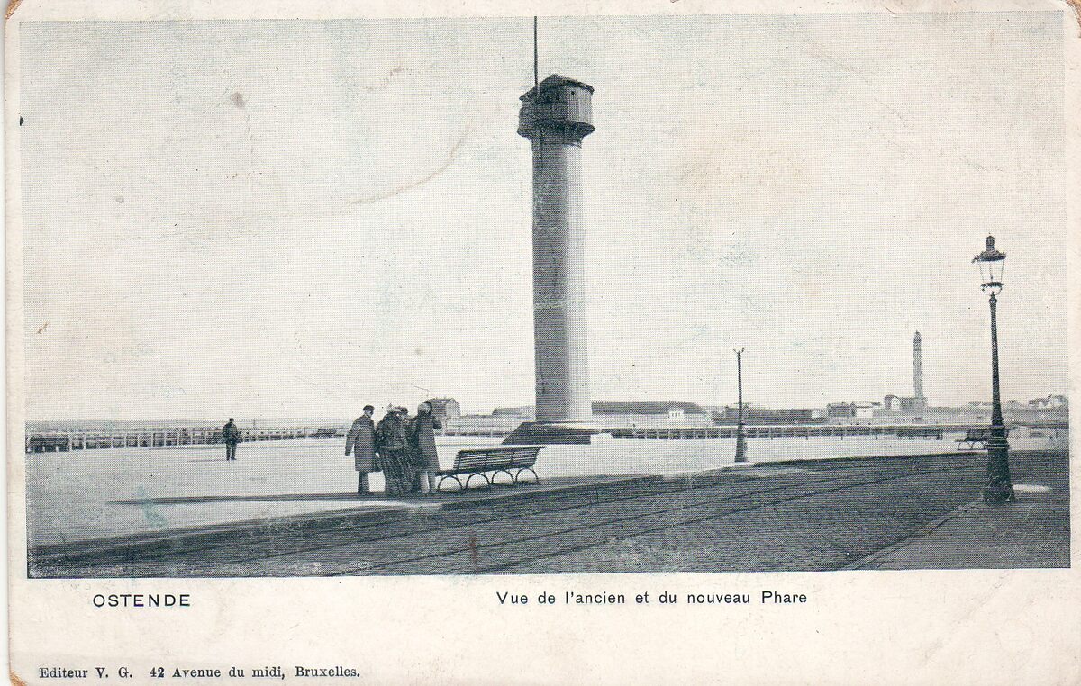 Victor Grégoire/V.G. - Ostende -Vue de l'ancien et nouveau Phare. - De eerste vuurtoren, bijgenaamd De Vlaggestok op de Zeedijk. In de achtergrond op de Oosteroever, de tweede vuurtoren.