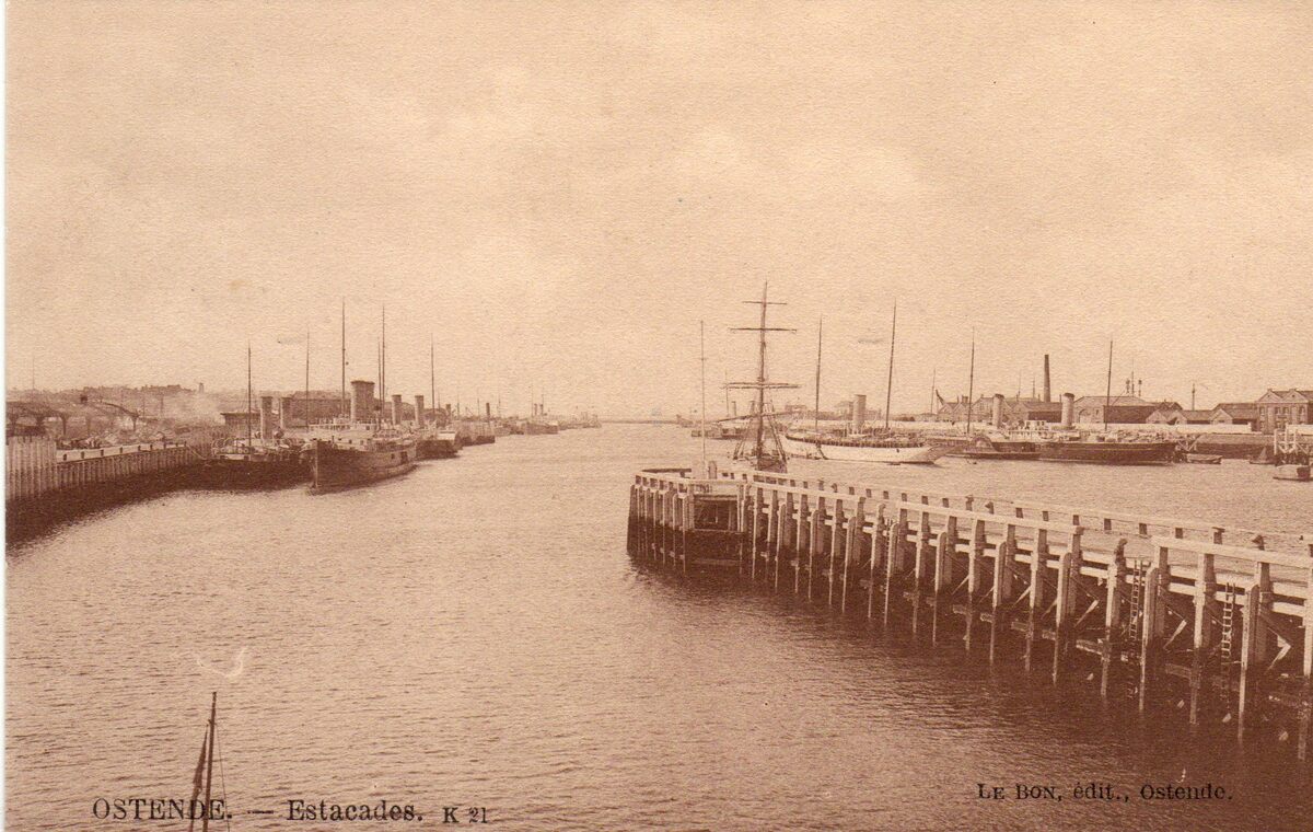 Le Bon, édit, Ostende, N° K21. - Ostende - Estacades. - Het wit vaartuig is het Koninklijk Jacht Alberta. - Aan de kaaien aangemeerd, pakketboten van de Oostende - Dover lijn. Links, het eerste zeestation, het nieuwe moet nog gebouwd worden